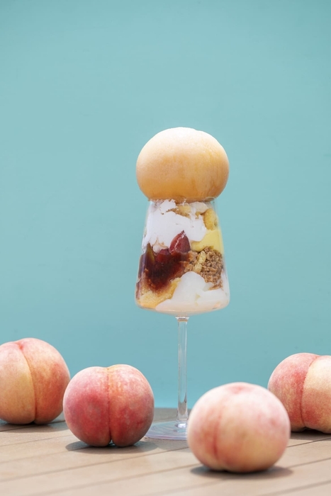 白桃コンポート、ゼリー、ジェラート、グラノーラなどを重ねた映えスイーツ。