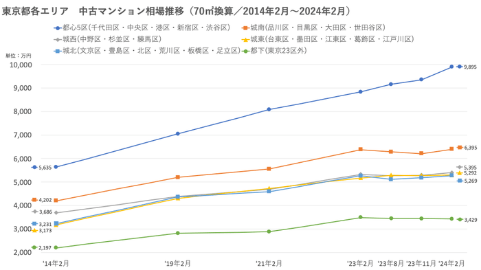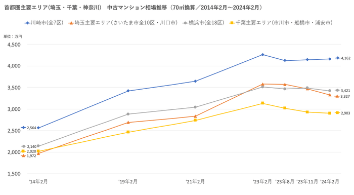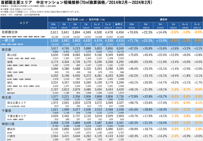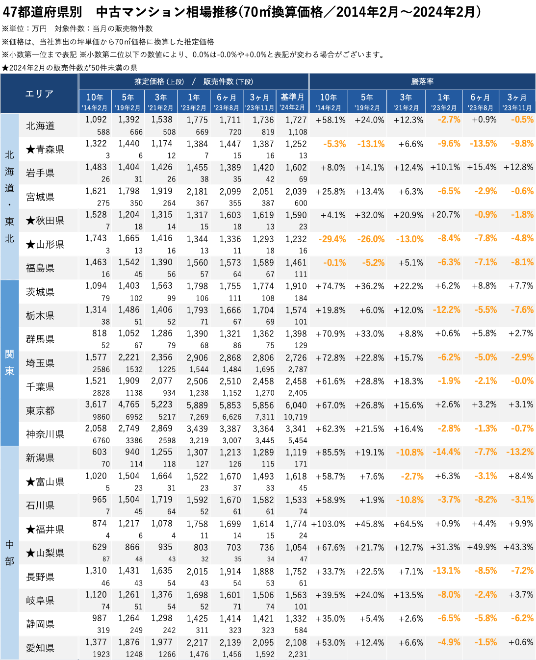 「不動産×WEB×ビッグデータ」の領域で、さまざまな不動産テックサービスを展開する株式会社ワンノブアカインド(本社:東京都港区、代表取締役社長:川島 直也、以下当社)は、当社が運営しているマンション情報サイト「マンションレビュー」の保有データを元に、全国の2024年2月の中古マンション相場を調査。坪単価をベースに70㎡での価格に換算した「中古マンション価格」*1について、10年前・5年前・3年前・前年からの推移を都道府県別・エリアごとにまとめましたので、発表いたします。
