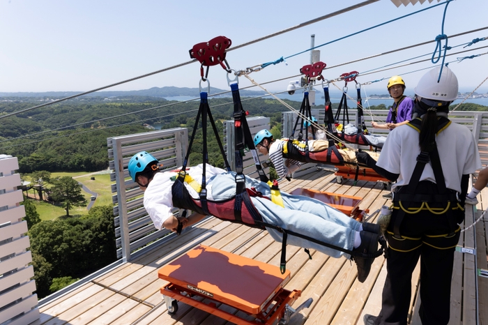 【ジップダイブ】ハーネスを装着してうつ伏せになり、英虞湾に向かって上空を滑り降りるアトラクション