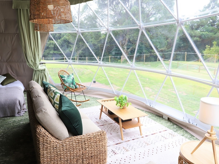 グランピングフィールドのコンセプトは、「満点の星空の下、芝の上で裸足で過ごせる極上グランピング」。