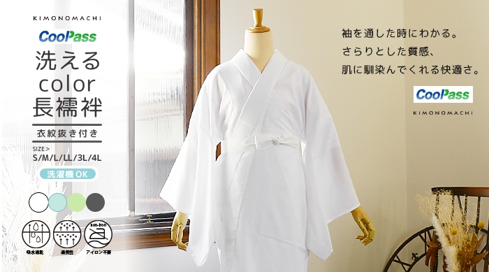 暑い時期の和装を快適にする、高機能ポリエステル素材CoolPassを使用した長襦袢です。吸水性と高い水分拡散力が好評のCoolPassは、さらりとした着心地で、暑い時期の着物のインナーとしても優秀。