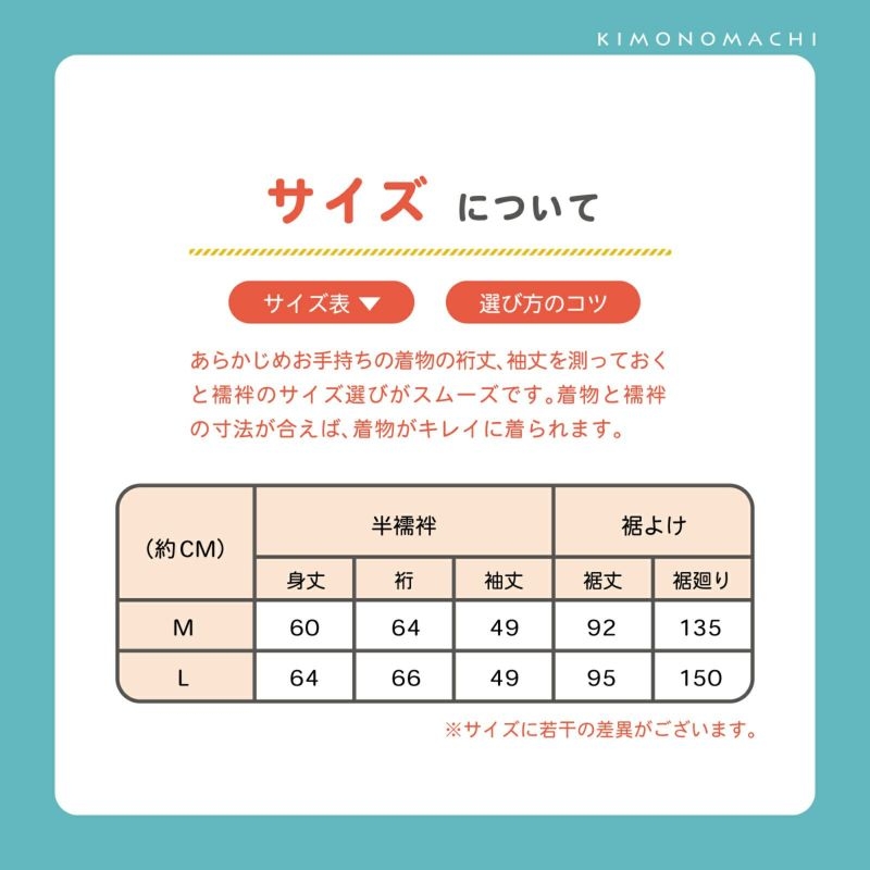 M 半襦袢:身丈60、裄64、袖丈49 / 裾よけ:裾丈92、裾まわり135