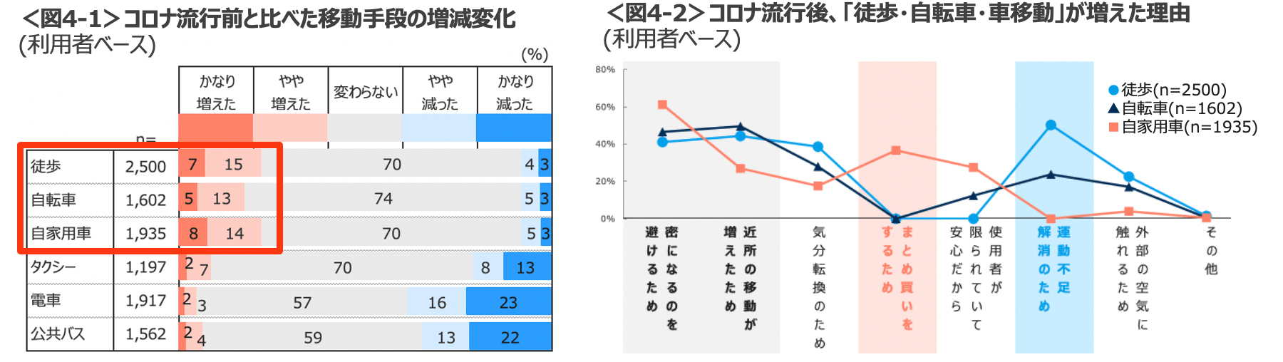 【移動手段の変化】 今回はあらたに「移動手段に対する意識変化」についても聴取した。コロナ流行前と比べて、現在の移動手段に変化があったか聴取したところ、「徒歩・自転車・自家用車」の利用が特に増加。一方、「タクシー・電車・公共バス」の利用は顕著に減少していることが明らかとなった。<図4-1> 徒歩・自転車・車の利用が増えた理由として、徒歩では「運動不足解消のため」、車では「まとめ買いをするため」といった特徴がみられたものの、共通して「密になるのを避けるため」「近所の移動が増えたため」が主な理由としてあげられた。<図4-2>不特定多数との接触機会は避け、個人完結で小回りのきく移動手段を現状は選択したいといった様子が窺える。