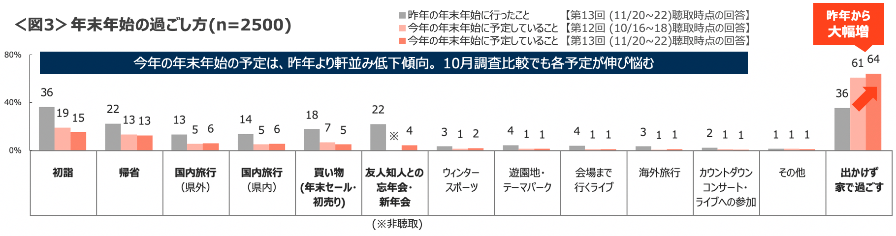 【年末年始の過ごし方】 今年の年末年始の予定について聴取したところ、「初詣・帰省・旅行・買物・忘年会(新年会)」 といった全項目で、「予定している」との回答は昨年を大きく下回った。一方「出かけず家で過ごす」が64%でTOPにのぼった。また10月調査時点との比較でも足元の感染者数増加を背景に各予定が伸び悩む結果となった。今年の年末年始は昨年行っていたことでも“外出控え”の意識か、避ける様子が垣間見える結果となった。<図3>