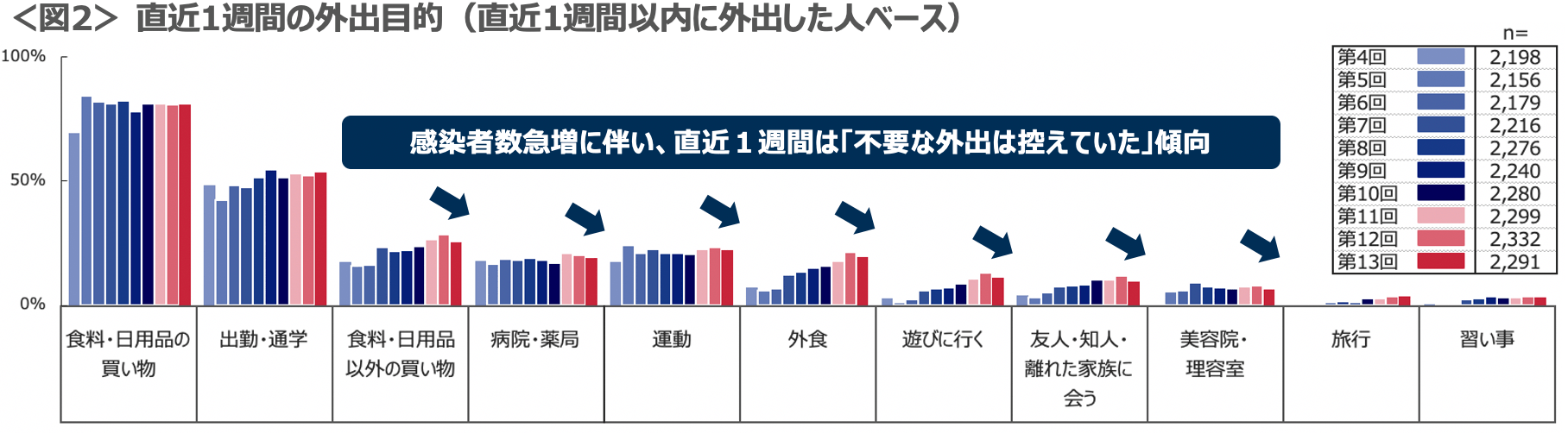 「直近1週間の外出目的」では、「出勤・通学・買い出し」以外の項目で10月より外出を控える傾向がみられた。Withコロナ生活への慣れや “行動の幅”が広がってきていた10月までの状況から一転して、再び警戒感が高まりつつある様子だ。<図2>