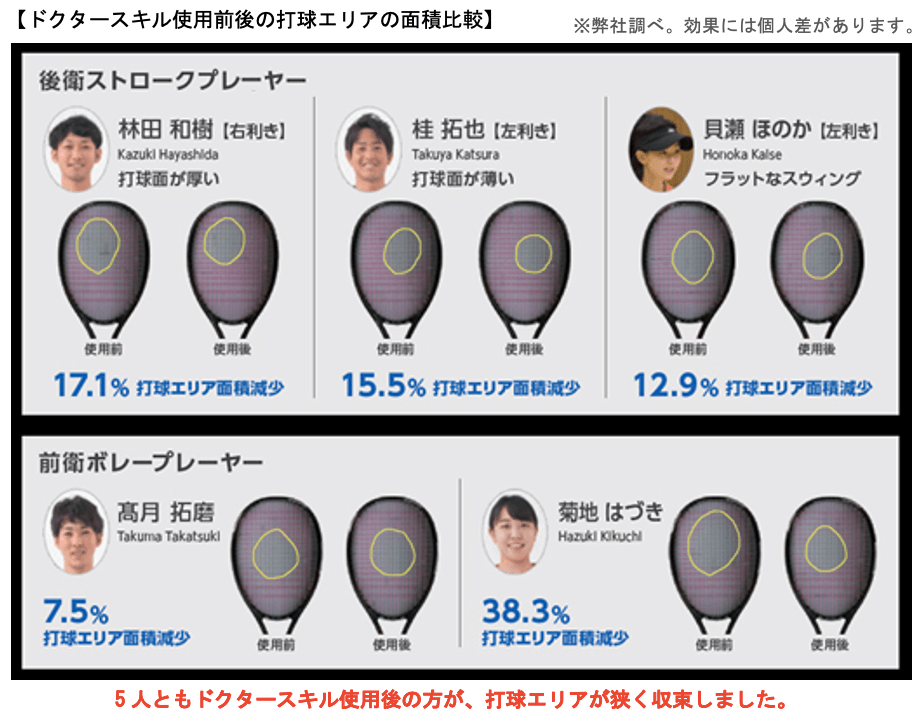 Dr.SKILL使用前後の打球エリアの面積比較では、測定したソフトテニスプレーヤー5人すべてが使用後の打球エリアが狭く収束※し、ボールを捉えているエリアの正確性がアップ。また、ターゲットに対する平均着弾点の距離とショットのばらつきを比較したコントロール性能差の検証では、10サンプル中8サンプルで使用後の優位性※を示しました。