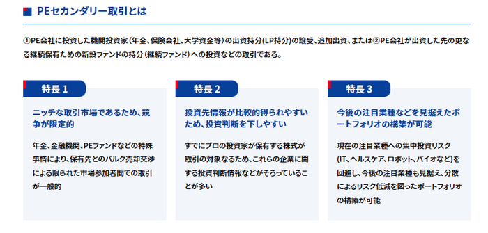 特にセカンダリー(流通)市場で取引されるPEファンドの特長、過去の取引先抜粋例、世界の著名な大学基金や富裕層などが注目するセカンダリーPEファンド投資の魅力について、参考となる詳しい内容を提供しています。