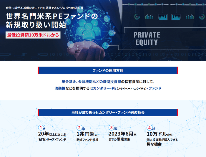 くにうみAI証券株式会社(本社:東京都千代田区丸の内、代表取締役社長:李 遠)は、2023年1月から新たに私募により取り扱いを開始したプライベート・エクイティ(PE)・ファンドに関する詳細な情報を紹介するランディングページ(LP)を発表しました。