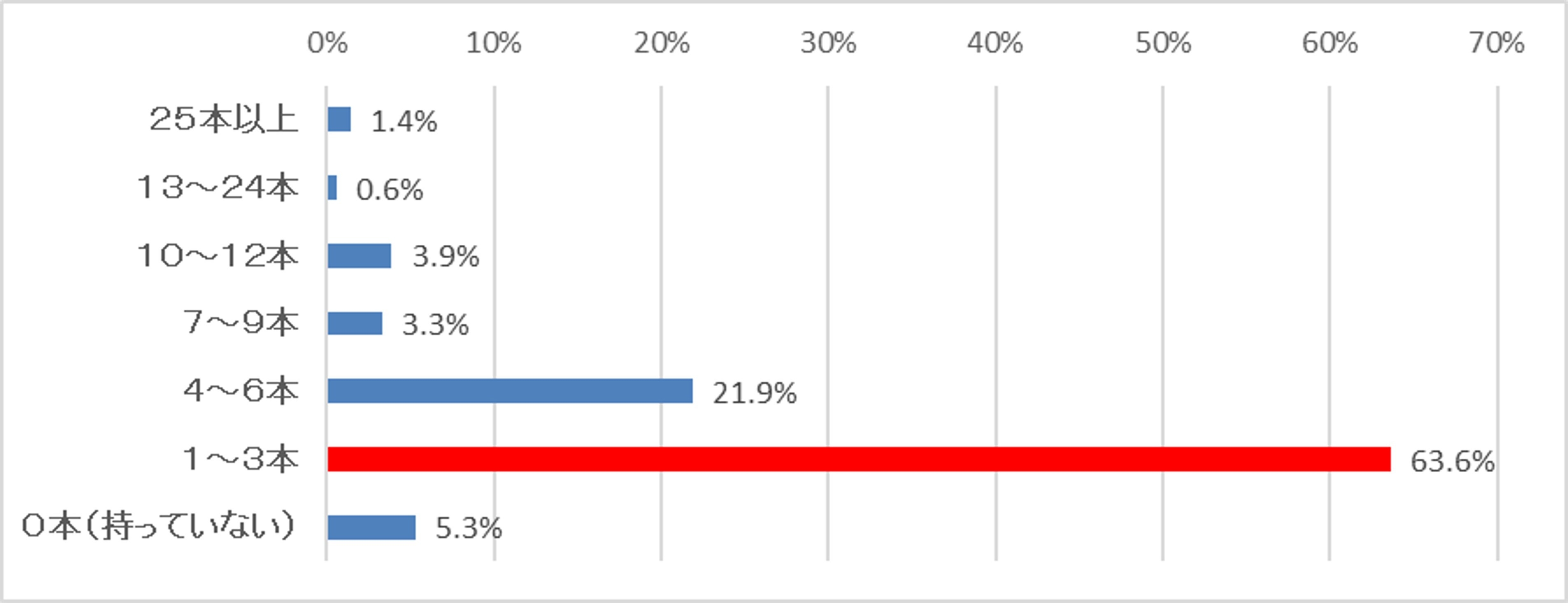 (2) カセットボンベを何本持っているかでは、「1~3本(63.6%)」が高く、政府推奨の「一人一週間6本」(※)には及ばない方が多い