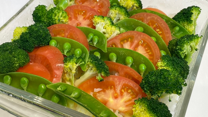 ①トマト、ズッキーニをスライス、ブロッコリーは小房に分ける。