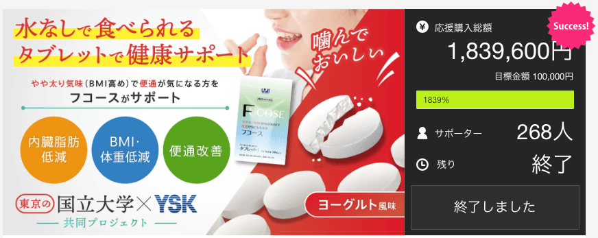 『やや太り気味(BMIが高め)で便通が気になる方のフコース』は、「運動が続かない」「忙しくて時間がない」「座り仕事が多い」…このようなライフスタイルと健康維持を願う気持ち、どちらにも応えるサプリメントです。新たな健康習慣として多くの方に知ってもらいたいとの思いからMakuakeに挑戦しました。2024年1月9日から268人のサポーターの方に応援購入いただき、目標の1,839%を達成することができました。2024年3月1日からの自社ウェブサイトでの販売では、健康習慣として継続していただけるように「定期お届けコース」「まとめ買い」をご用意しました。