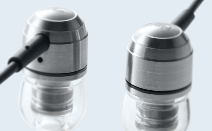 イヤホンの筐体は、ステンレススチール素材の旋盤による削り出し加工で成形されています。重厚で硬質なステンレススチールならではの精巧なディテールによる、整然と連なる波紋を想起させる造形が、格調高い佇まいを見せます。筐体の前後の勘合部には、ハイコントラストな配色のデコレーションリングをあしらい、上位モデルであることを視覚的に強調しました。