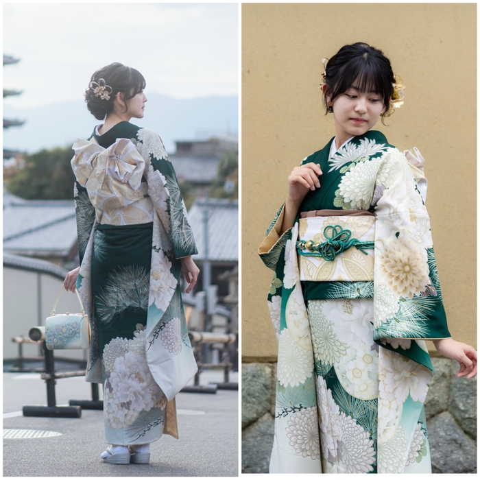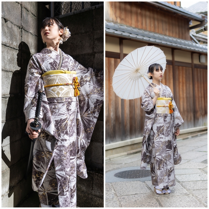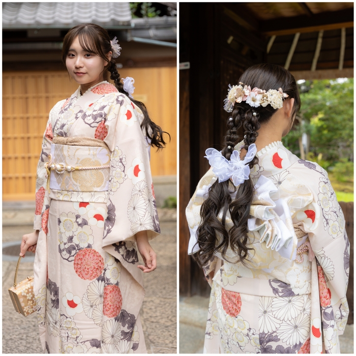 成人式で着る物ほどきらびやかで無く,程よい落ち着いた雰囲気の色柄で、京都の美しい街並みの中に自然と溶け込むデザインとなっています。観光の際にも、周囲の景色と調和しつつ、特別な日の装いとして華やかさを添えることができます。