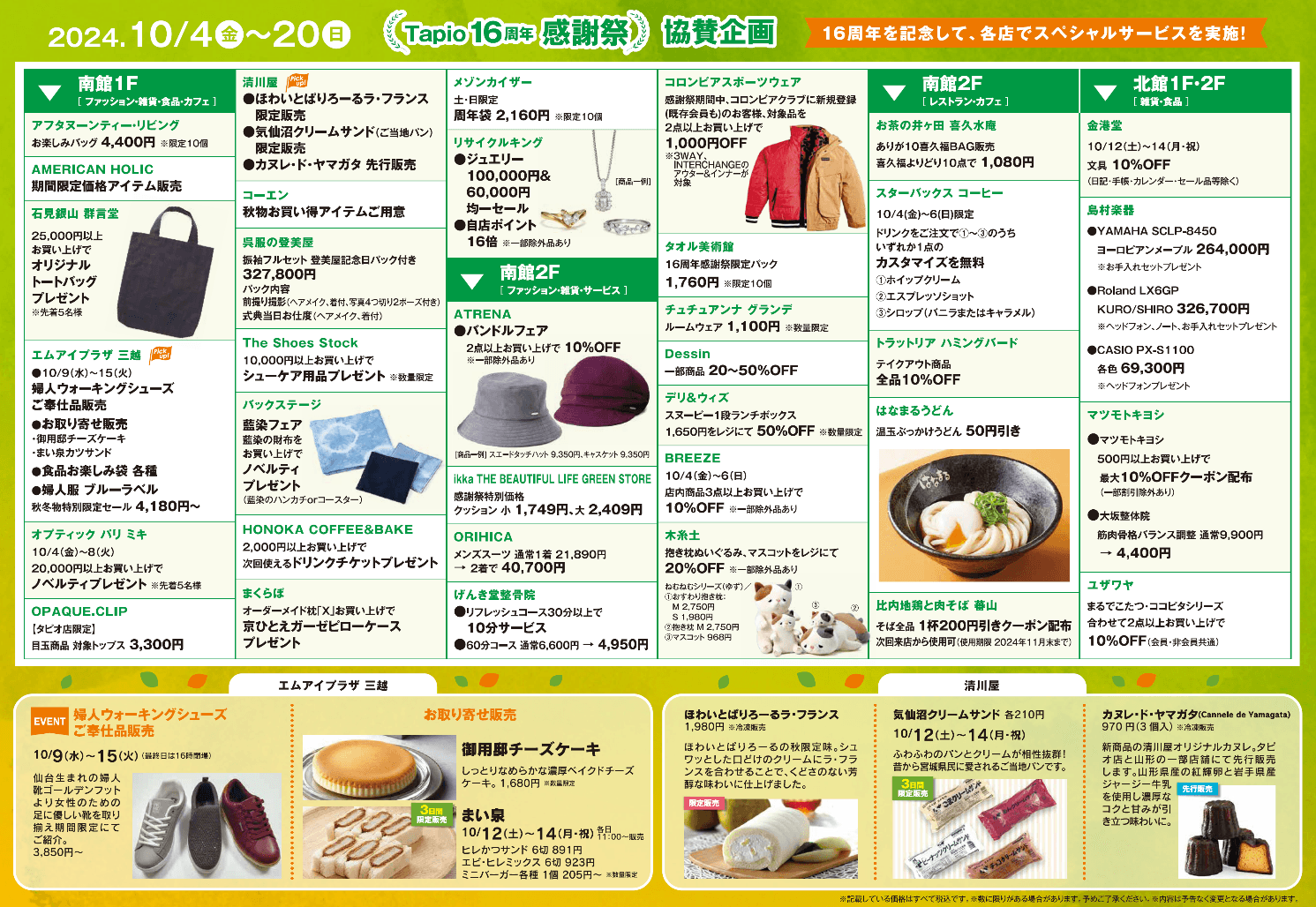 館内35店舗で16周年感謝祭を記念した協賛企画を実施。日頃ご愛顧いただくお客様への感謝を込めてお得にお買い物をいただける企画を多数ご用意しております。