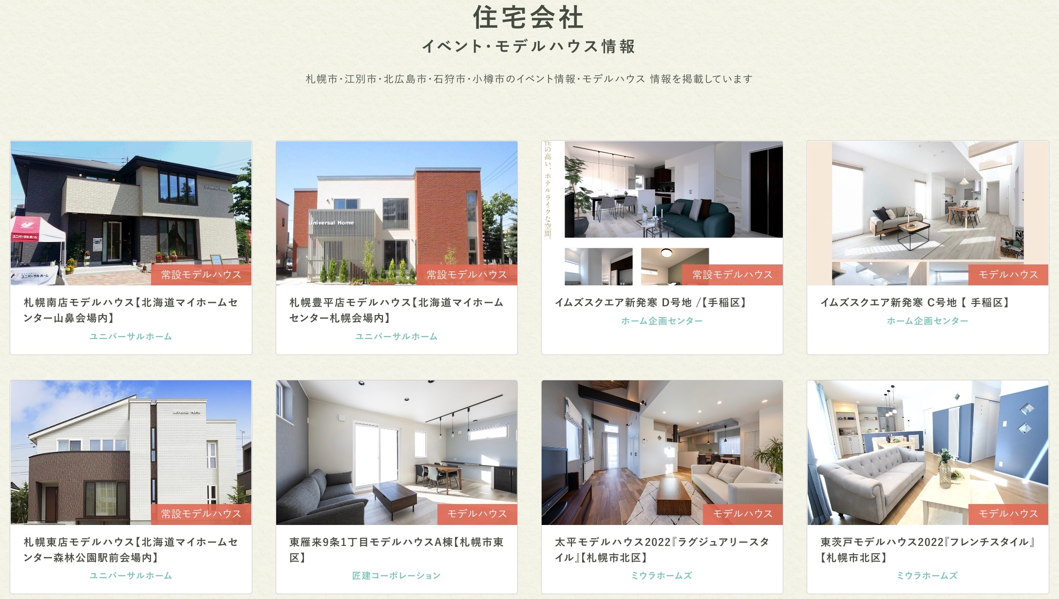 住宅業界紙「北海道住宅通信」を発行する北海道住宅通信社(本社:北海道札幌市)が自社で運営する自宅モデルハウス見学サービス「イエコネ」は、2023年1月5日より札幌近郊エリアの住宅会社(ハウスメーカー・工務店)別のイベント・モデルハウス情報(以下:モデルハウス情報)を掲載するページを公開しました。