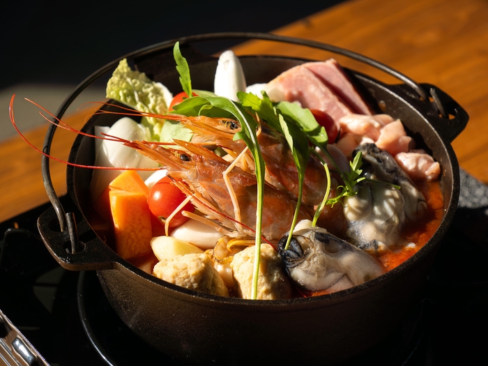 12月のBBQ鍋では、牡蠣、ボイルホタテ、鶏モモ、せせり、ホウボウ、赤海老、ベーコン、つくねなど、冬の味覚が豊富に詰まった「鍋食材」を贅沢に使っています。