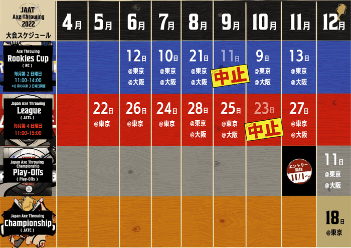 「"Japan Axe Throwing League 2022"〜駆け上がれ、斧投げ日本一へ。〜」は、2022年5月から11月の期間に毎月開催されます。
