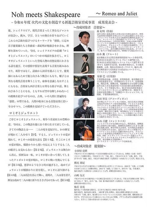 今回、シェイクスピアの悲劇『ロミオとジュリエット』のいくつかの場面を抜きだし、ロミオやジュリエットといった登場人物の喜怒哀楽にかさなる謡を選び、その感情や情景を表現する音楽を組みあわせた。新作ではなく、謡曲から詞章を選ぶことで、能楽師にはあらためて能と向きあう機会にもなり、囃子とは異なる現代音楽を舞うことで、身体を意識しなおすことにもなる。音楽家も西洋音楽とは異なる拍子や謡、舞と向きあうことになる。