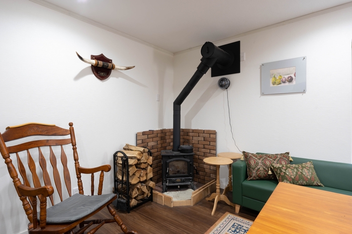 リビングは大人数でもゆったりと使え、冬季には薪ストーブが利用可能。