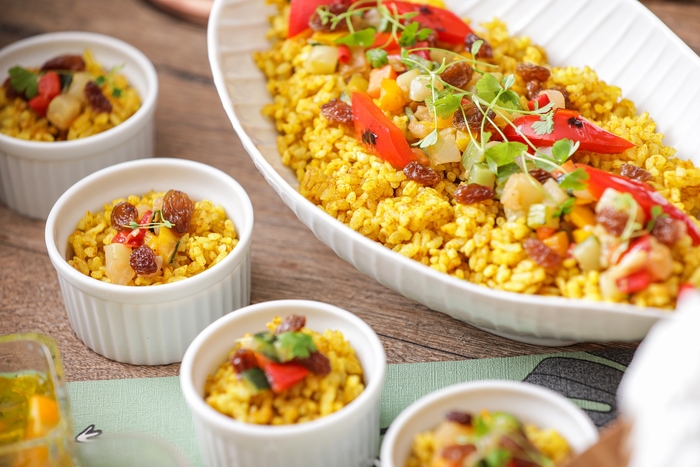 【フード】チキンウイングの醤油麹マリネ コンフィ仕立て 黒胡椒の辛味/スパイシーなドライカレー サルタナレーズンと彩野菜と共に/カラフルなポテトの味わい 辛みとレモンの酸味で