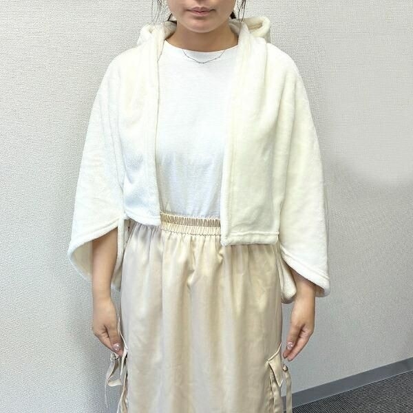 肩から羽織ってボタンを留めれば、ポンチョスタイルに。冷える肩に強い味方です。