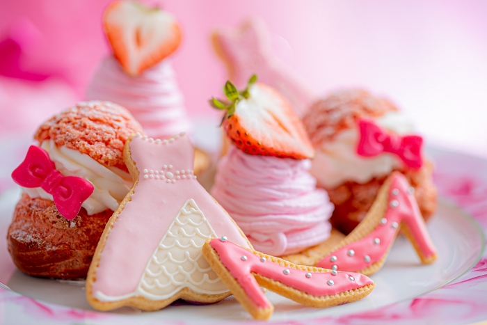 ~1皿目~ストロベリーピンクモンブラン/リボンシュークリーム/ピンクドレスアイシングクッキー/ピンクヒールアイシングクッキー
