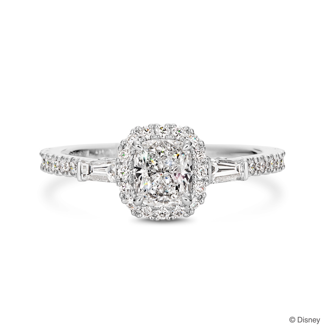 「シンデレラ」をイメージしたクッションカットダイヤモンドをセンターに。石座の隣にはテーパーカットのダイヤモンドを留めました。32ピースのメレダイヤモンドが、魔法のように華やかなきらめきを放ちます。側面には「お城」の装飾をモチーフにしたデザインを施しました。石座の裏側には、「シンデレラ」の夢を叶えるきっかけとなった「ガラスの靴」のモチーフを添えています。