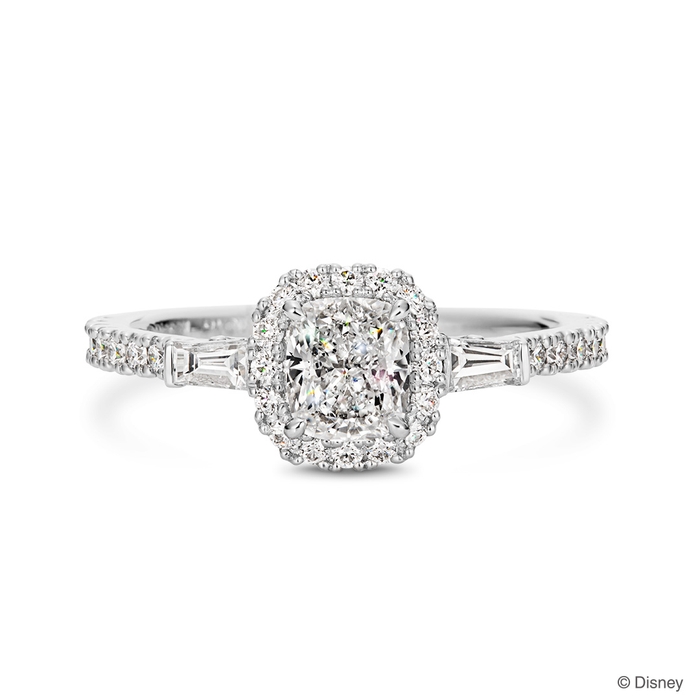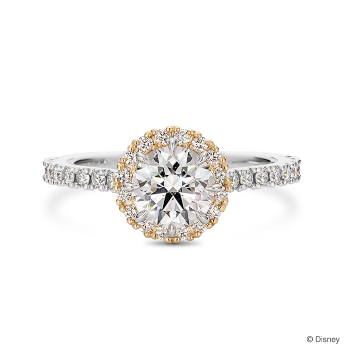 1.0ct台のシンプルながら華やかなラウンドカットダイヤモンドがセンターに輝くデザインです。大粒のダイヤモンドを支える石座は、「ベル」と「野獣」が心通じ合い踊るボールルームの装飾をイメージ。34ピースのメレダイヤモンドがきらめきを添えます。石座の裏側に、真実の愛へと導いた「魔法のバラ」のモチーフをデザインしています。