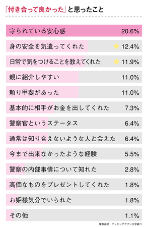 ●警察官に頑張ってなったという気持ちと仕事に誇りを持っているので、バリバリキャリアウーマンで自分もすごいんだぞというタイプの女性より、彼を立てて認めて褒めてくれる人がいいのかなと思いました。(28歳・茨城)