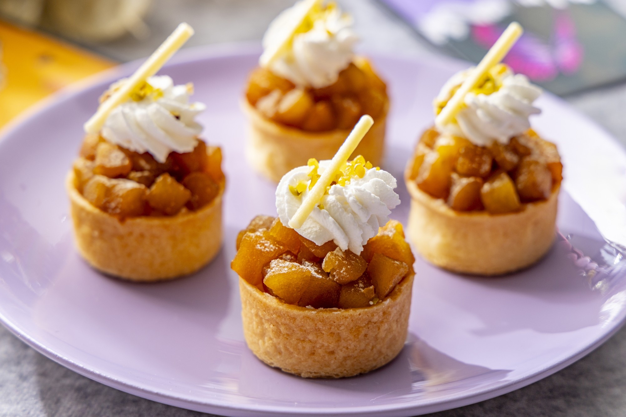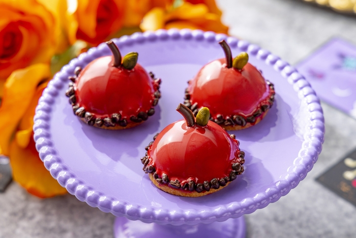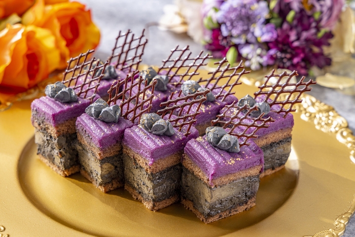 約15種類のセイボリーには、ビーツの鮮やかな色合いが美しい「漆黒のドリア~イカ墨とビーツ~」、星や月型のチップスを飾った「魔女のシーザーサラダ」、魔女がコトコト煮込んだ濃厚な「紫芋のポタージュ」など、宮殿のパーティーに華を添えるメニューが登場。その他、りんごジャムで甘みとまろやかさを加えた「りんごジャムの照り焼きチキン」や「キノコのマリネとピンクのビーツバターのオープンサンド」、「かぼちゃのキッシュ ハーブの香りのナッツデュクセル添え」など秋らしいラインナップもお楽しみいただけます。