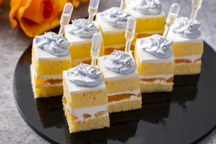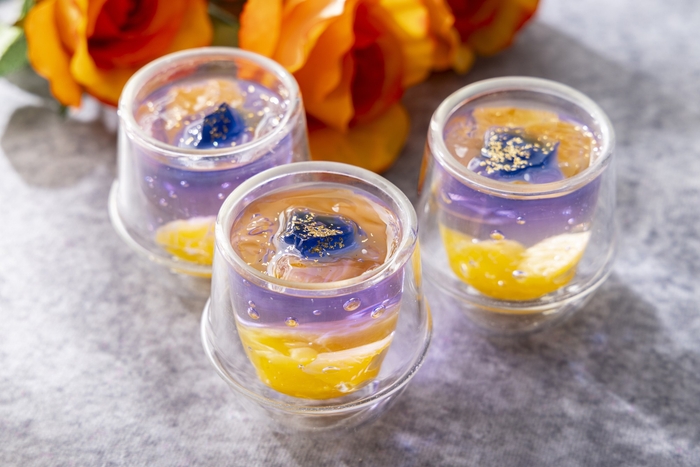 透明感のある紫色のゼリーは、食べるとオレンジ味。魔女の宮殿にあるジュエリーボックスをイメージして、寒天ゼリーで宝石を表現しました。オレンジの爽やかな味わいをご堪能ください。