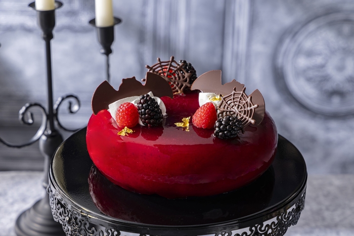 チョコチップ入りのチョコクリームに洋梨をサンドしたショートケーキです。紫芋のクリームでハロウィーンらしい色合いを表現しました。パーティー衣装のようなレースやリボンをデザインした鮮やかな一品です。