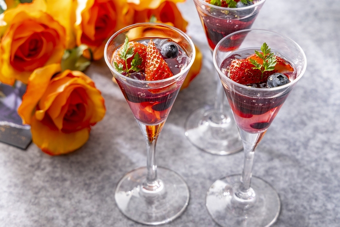パーティーのウェルカムドリンクのような鮮やかなゼリーは、ブルーベリーゼリーを真ん中に入れて3層に。上のゼリーには食感の違いにこだわって、クラッシュゼリーをのせました。森になる実のように、ミックスベリーをふんだんに入れた一品です。