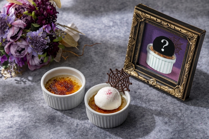 ライブステーションには、魔法をかけて作る「魔女の謎解きスイーツ 栗のブリュレ」が登場。バーナーで炙ると消えていく綿あめの様子やキャラメリゼの香ばしさを楽しめる栗のブリュレ。ブリュレにはバニラアイスを添え、最後に3色のキラキラと輝くパウダーからお好きな色をお選びいただき振りかけます。綿あめの消えゆく様子やキラキラパウダーの煌びやかさが魔法のような一品です。また、今回は自由参加で楽しめる謎解きをテーブルにご用意。謎を解いた方だけがもらえる秘密のスイーツをぜひご堪能ください。
