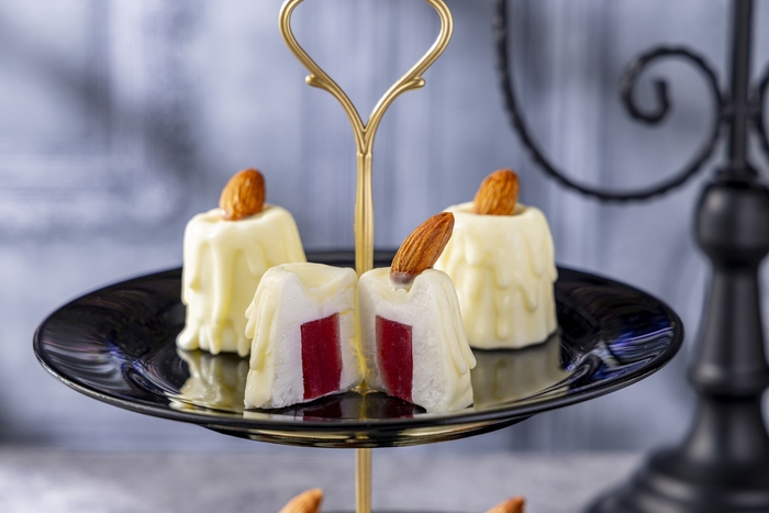 ダークとプラリネチョコレートを流したタルトにマシュマロをのせ、ホワイトチョコレートで包んだスモアタルトです。宮殿にゲストとして招かれたゴーストの表情もお楽しみください。