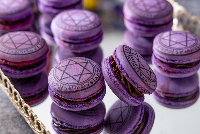 魔女の魔法で紫と赤のマーブルカラーに染まったマカロン。赤すぐり、カシス、ブラックベリー、ブルーベリーのミックスベリーガナッシュクリームをサンドしています。