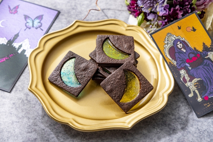 ココアクッキーに飴を流したパリッとした食感が楽しいステンドグラスクッキーは、黄色と水色の2色をご用意。2色を重ねると色が変わるマジカルクッキーです。