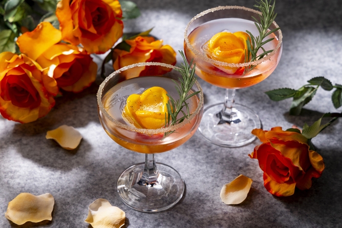 宮殿のパーティーに魔女が用意したウェルカムドリンクをイメージしたスペシャルドリンクは、ソーダを注いでからブラッドオレンジシロップを落として2層にしています。グラスに浮かべたオレンジのお花型フローズンは、時間の経過とともに花弁のように散っていき、まるでパーティーの楽しいひとときを表しているよう。ローズマリーの香りと煌びやかさが、華やかなパーティーにぴったりな一杯です。