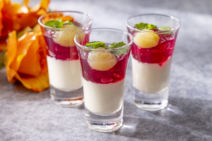 レアチーズプリンとぶどうゼリーを合わせたさっぱりとした後味のグラスデザート。ピオーネを丸ごと一粒入れ、果肉も堪能できる贅沢な一品に仕上げました。