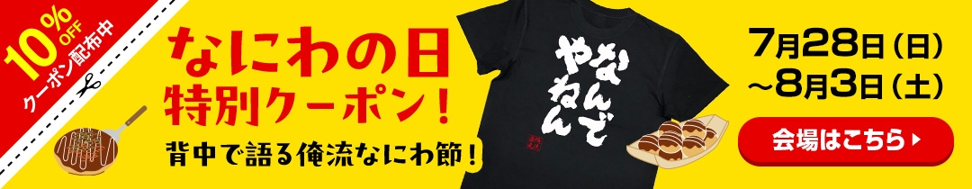 7月28日のなにわの日から先着100注文に、俺流デザイナーTシャツを通常価格より10%オフになるクーポンを配布いたします。この機会に、ご自宅用はもちろん、ギフト用としてもぴったりなオリジナル商品をお求めください。