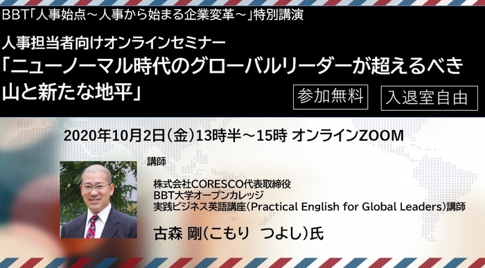 あらゆる年齢層に対し生涯に渡るリカレント教育を提供する株式会社ビジネス・ブレークスルー(所在地:東京都千代田区、代表取締役:柴田巌、以下BBT)は、グローバル人材育成担当者向けに、BBT大学オープンカレッジ「実践ビジネス英語講座」の講師で、株式会社CORESCO代表、マーサー日本法人シニアフェローの古森 剛(こもり つよし)氏によるオンラインセミナーを10月2日(金)に開催します。(参加無料)