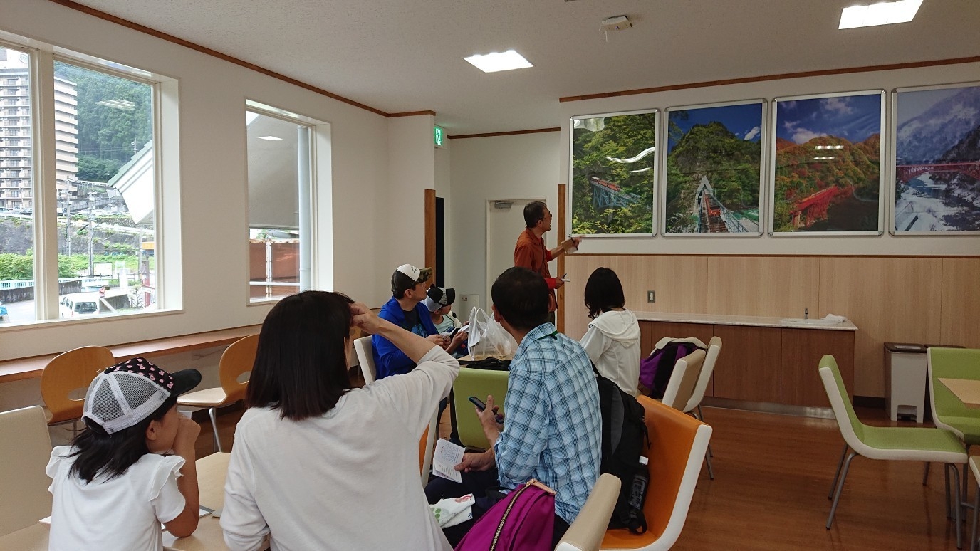 宇奈月駅構内特設受付場所にて受付開始(8時30分)→宇奈月駅2階集合(9時00分)「体験案内人紹介、諸説明、宇奈月駅2階見学」→宇奈月駅出発(9時42分)→欅平駅到着(11時00分)「注意事項等説明」→欅平周辺散策(名剣橋折り返し、河原園地、河原展望台・足湯)→昼食→欅平駅出発(13時10分)→宇奈月駅到着(14時28分)→宇奈月国際会館セレネにて親子で工作体験(14時40分~16時00分) 終了