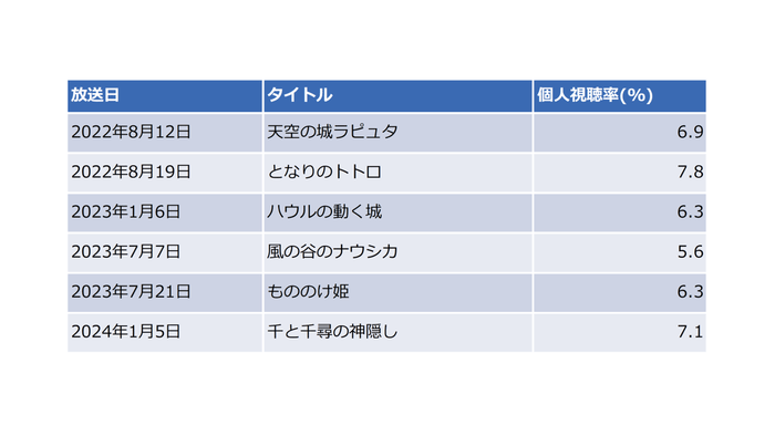 今回は2022年8月以降のスタジオジブリ・宮崎駿監督作の6タイトルを分析しました。タイトルと全体の個人視聴率は表のとおりです。