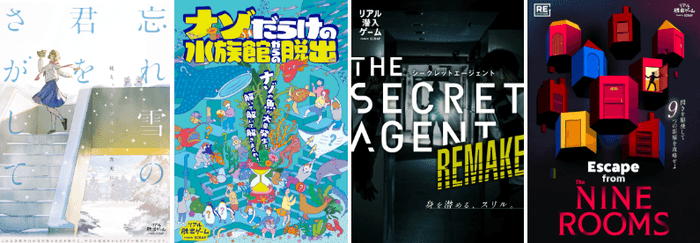 オープニングを飾るイベントは、ディレクターのきださおりが手がける新作『忘れ雪の君をさがして』、33分で大量のナゾに挑むシリーズ第2弾『ナゾだらけの水族館からの脱出』、人気シリーズ「リアル潜入ゲーム」の第1作目『THE SECRET AGENT』REMAKE、2019年の登場以降に同名のシリーズ作品が制作されている『Escape from The NINE ROOMS』の全4コンテンツ。