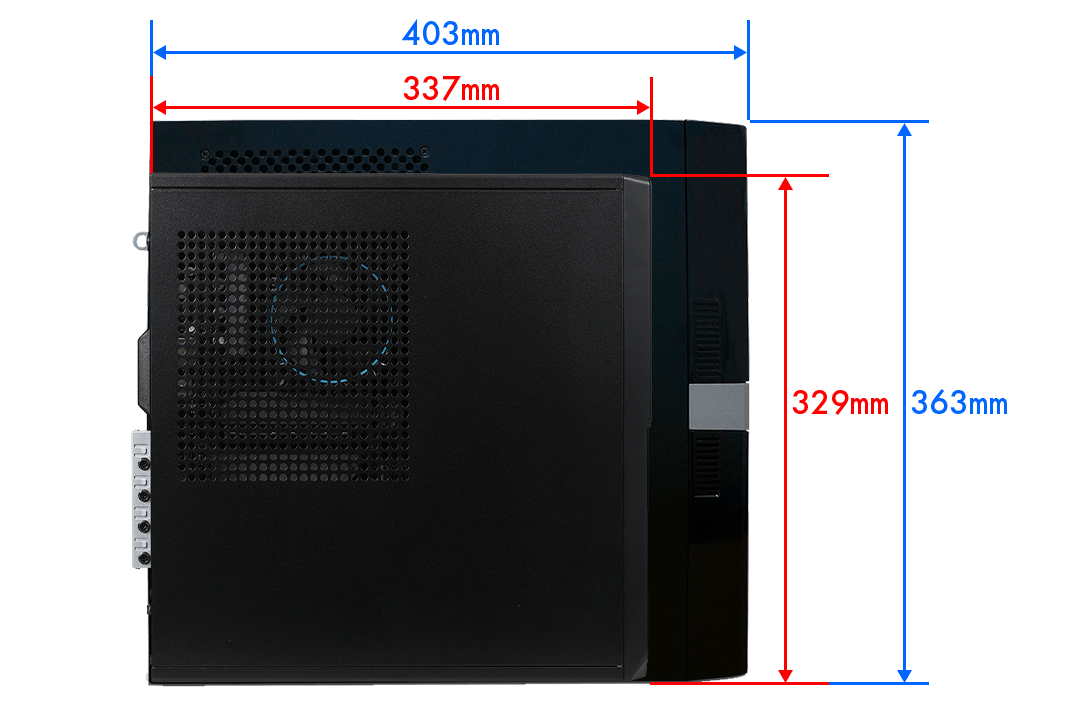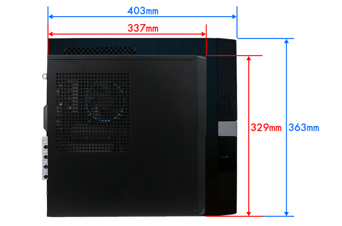 新型設計となったSTYLE∞ S-Classは、幅95mm×奥行337mm×高さ329mm(最大突起物除く)になり、インテル Core i7 プロセッサーやAMD Ryzen 7 プロセッサー搭載をしながらも、当社従来品(幅98mm×奥行403mm×高さ363mm 最大突起物除く)比で約26.5%のサイズダウンを実現しました。デスク周りのスペースに余裕を持たせたい方におすすめです。