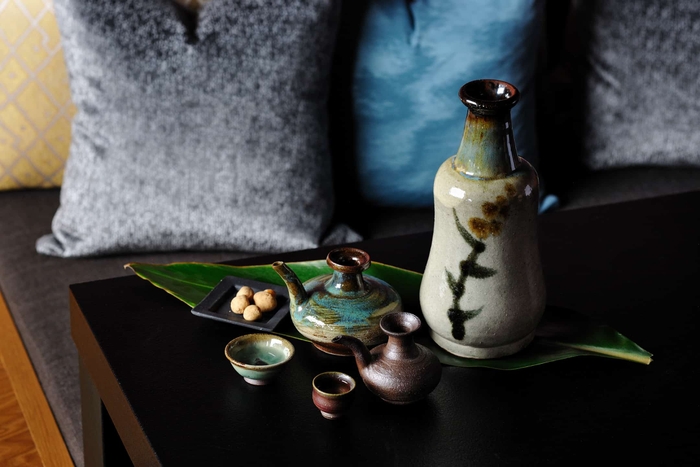 客室では、星のや沖縄のスタッフから泡盛の歴史や特徴を聞き泡盛を楽しむ「泡盛インビテーション」を行います。今年は、伝統的な酒器で甕貯蔵の古酒(くーす)を提供します。古酒は、ただ寝かせて置くだけではなく、甕から甕へ仕次ぎを行い、刺激を与えながら親酒を大切に育てる、琉球王朝時代から続く先人たちの知恵です。酒器は、上を向いた注ぎ口が特徴の「カラカラ」と小さな御猪口「ちぶぐわー」が用意され、素焼きの焼き締め「荒焼(あらやち)」と釉薬を施した「上焼(じょうやち)」の異なる酒器で、泡盛の華やぐ香りや舌触り、風味の違いを堪能します。