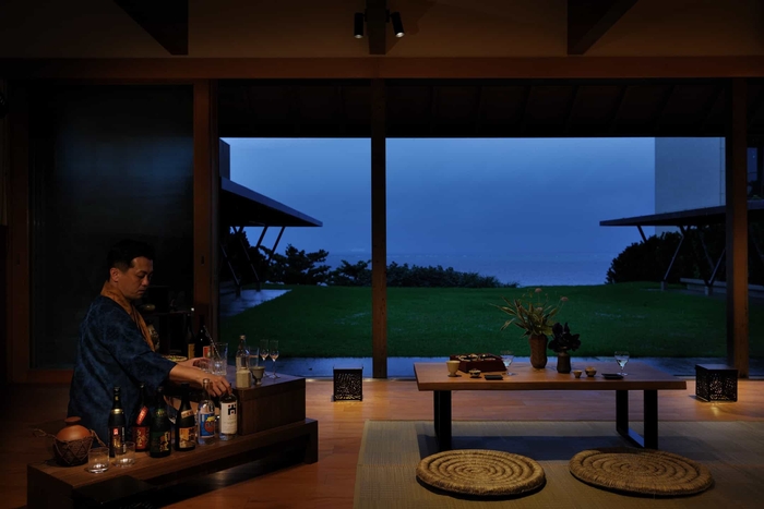 食事の後には、道場に設えたプライベートバーに場所を変え、海からの風と波音に包まれながら夜更けまで泡盛談義に花を咲かせます。バーには、9種の肴を詰め込んだ「泡盛ダイアログセット」と、県内各地の酒造から20種類以上の泡盛を揃えました。まずは泡盛を選びスタッフがすすめるグラスや飲み方を聞き、そして肴を選ぶ。無限にある組み合わせの中から、自分好みの最高の相性を探求します。