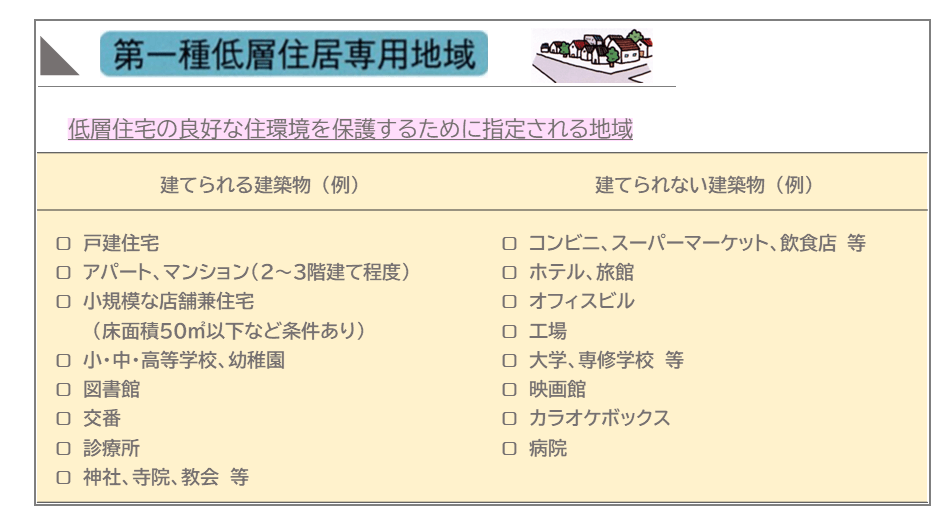 例えば、13ある用途地域の中の『第一種低層住居専用地域』を見てみましょう。