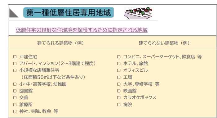 この地域は低層住宅の良好な住環境を守るための地域で、建物の高さが厳しく制限されます。コンビニなども原則建てられないため、静けさが保たれる「閑静な住宅街」を形成します。落ち着いた暮らしを最も優先したい人向けのエリアです。