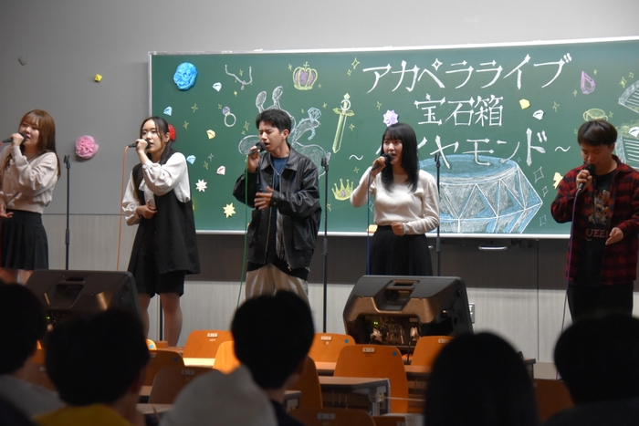 初日の1日は昼過ぎから雨がぱらつき、2日は雨足が強くなって午後には一部の企画が中止となりましたが、天白キャンパスでは、共通講義棟北前やサンクンガーデン前、グリーンパーク前などのステージの周囲には常に人だかりができる盛況ぶりで、アカペラライブやバンド演奏、ダンスパフォーマンスなどが人気を集めたほか、小原章裕学長もステージに立って学歌を熱唱してエールを切る場面も。チアリーディング部は雨のため旧体育館に会場を移して演技を熱演し、盛んな拍手を浴びていました。